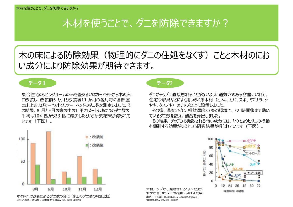 A: 木の床による防除効果(物理的にダニの住処をなくす)ことと木材のにおい成分により防除効果が期待できます。