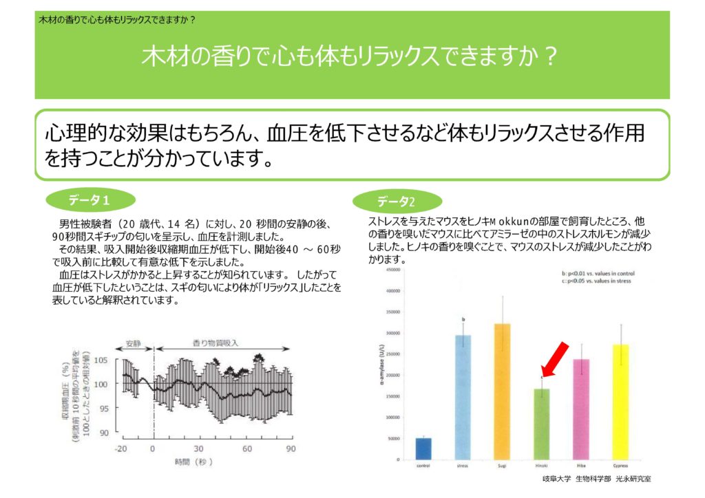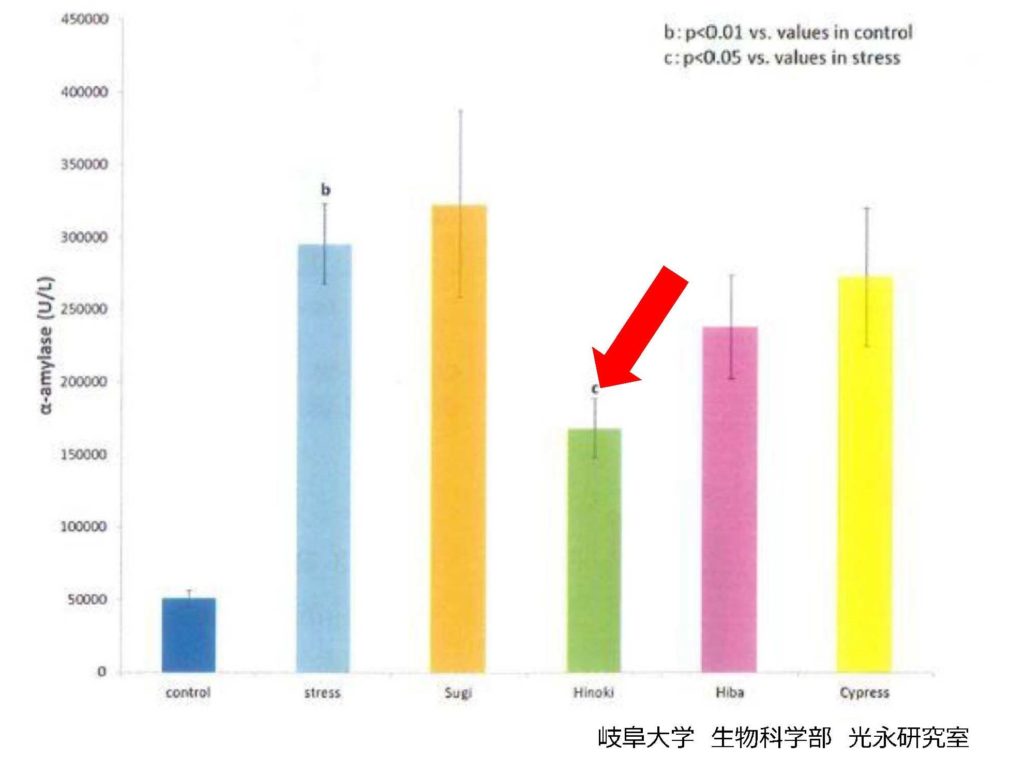 ストレスを与えたマウスをヒノキMokkunの部屋で飼育したところ、他の香りを嗅いだマウスに比べてアミラーゼの中のストレスホルモンが減少しました。ヒノキの香りを嗅ぐことで、マウスのストレスが減少したことがわかります。