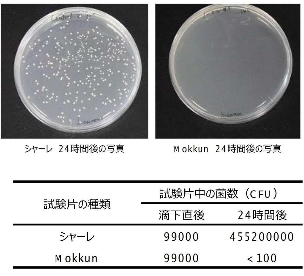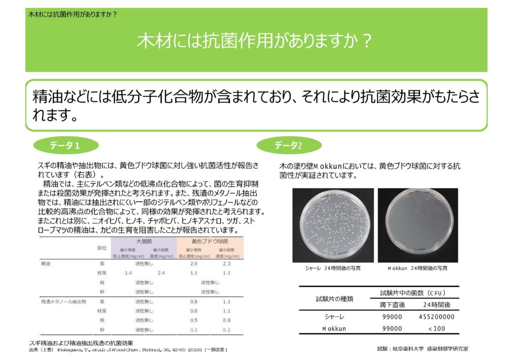 木の塗り壁Mokkunにおいては、黄色ブドウ球菌に対する抗菌性が実証されています。