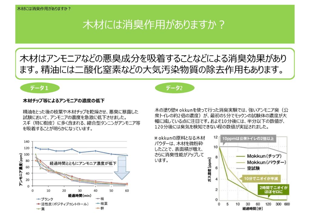 A: 木材はアンモニアなどの悪臭成分を吸着することなどによる消臭効果があります。精油には二酸化窒素などの大気汚染物質の除去作用もあります。