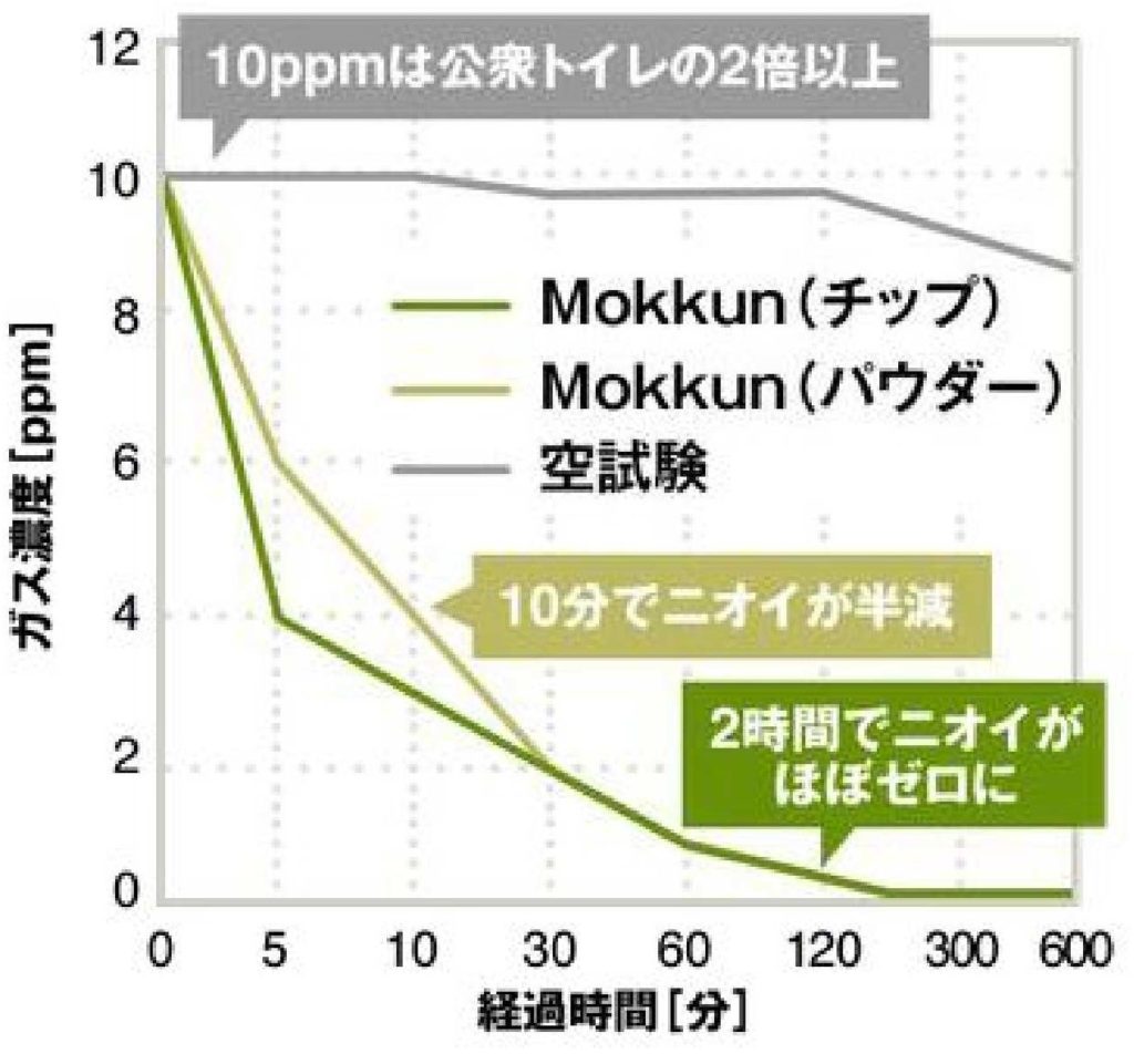 木の塗り壁Mokkunを使って行った消臭実験では、強いアンモニア臭(公衆トイレの約2倍の濃度)が、最初の5分でモックンの試験体の濃度が大幅に減している点に注目です。およそ10分後には、半分以下の数値が、120分後には臭気を検知できない程の数値が実証されました。