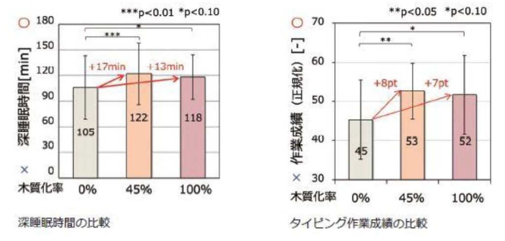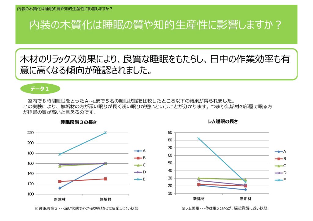A: 木材のリラックス効果により、良質な睡眠をもたらし、日中の作業効率も有意に高くなる傾向が確認されました。