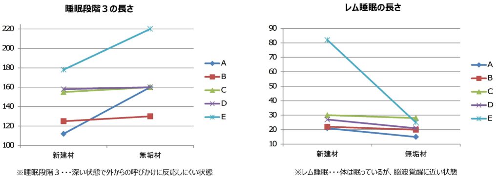 この実験により、無垢材の方が深い眠りが長く浅い眠りが短いということが分かります。つまり無垢材の部屋で眠る方が睡眠の質が高いと言えるのです。